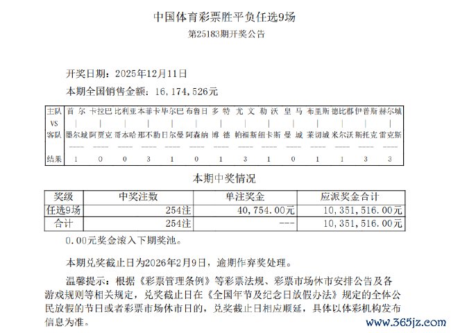 北京技艺12月11日,赢输彩第25183期任九开奖恶果揭晓。本期任九共开出254注,单注奖金40,754元。本期任九投注总和为16,174,526元。